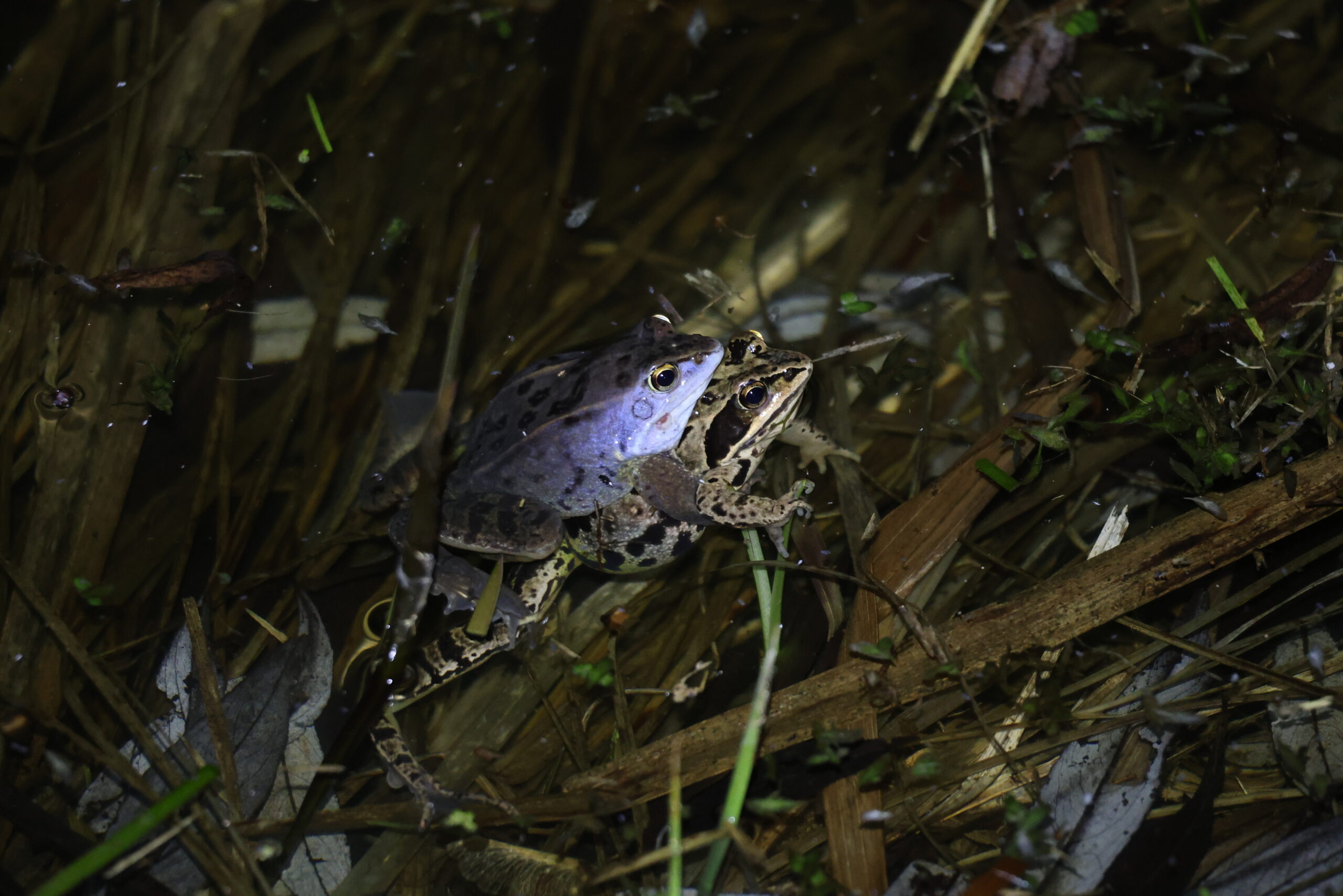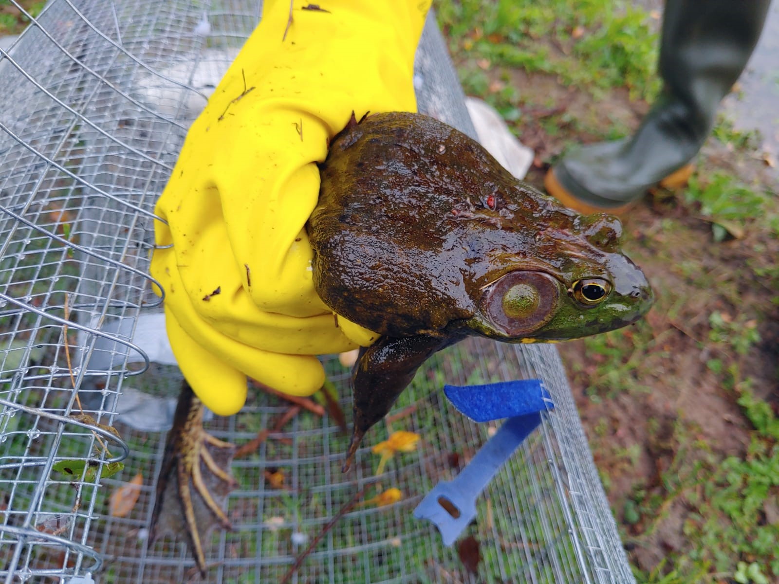 Der im mittleren und östlichen Nordamerika heimische Nordamerikanische Ochsenfrosch (Lithobates catesbeianus) wurde weltweit in viele Länder eingeführt. Nach bisherigem Kenntnisstand wird davon ausgegangen, dass das Vorkommen des Ochsenfroschs mit erheblichen negativen Auswirkungen auf die heimische Fauna verbunden ist. Bisher gibt es jedoch wenige effektive und effiziente Methoden zur Bestandsregulation. Seit 2016 wird er auf der Liste invasiver gebietsfremder Arten von unionsweiter Bedeutung (Unionsliste) geführt. In der Oberrheinaue nördlich von Karlsruhe befindet sich ein etabliertes Vorkommen. Mit den bisher eingesetzten Mitteln und Methoden scheint lediglich die weitere Ausbreitung stark verlangsamt zu werden, eine Entfernung aus den besiedelten Gewässern scheint nicht zu gelingen. Im Rahmen einer 2021 durchgeführten Masterarbeit wurde in 50 Nächten der Einsatz von Reusenfallen mit Klangattrappen evaluiert. Zum Einsatz kamen zwei zum Teil modifizierte, bereits in der Literatur als vielversprechend bewertete Fallentypen sowie eine handelsübliche Krebsreuse. Dabei wurde deren Wirksamkeit sowohl zur quantitativen Entnahme als auch zur Entnahme von konkreten Einzeltieren getestet. Als Lockmittel dienten Klangattrappen mit verschiedenen Schalldruckpegeln und Audio-Setups. Die Fallen – ebenso wie die Lockmittel – wurden im Laufe der Untersuchung verändert. Eine messbare Lockwirkung der Klangattrappe war vorhanden, die verschiedenen Schalldrucklevel und Audio-Setups zeigten in ihrer Lockwirkung jedoch keinen merklichen Unterschied. Auch konnten keine Ochsenfrösche gezielt mit einer Klangattrappe landeinwärts vom Ufer weggelockt werden. Insgesamt sind 14 subadulte und adulte Individuen entnommen worden, was – gemessen an der großen Anzahl an Fallenexpositionen – zu der Bewertung führt, dass kein effektiver und effizienter Einsatz dieser Systeme möglich ist.